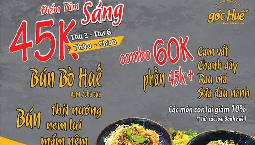 Chương trình Điểm tâm sáng ĐỒNG GIÁ 45K áp dụng khi Khách hàng dùng hoặc đến mua mang về tại Góc Huế - 41 Kỳ Đồng, Quận 3 từ 7:00 - 09:30 T2 - T6.