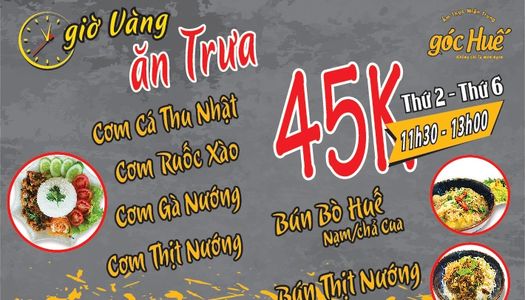 Chương trình GIỜ VÀNG ĂN TRƯA áp dụng khi Khách hàng đến dùng hoặc đến mua mang về tại Góc Huế- 41 Kỳ Đồng, Quận 3 từ 11:30 - 13:00 T2 - T6
